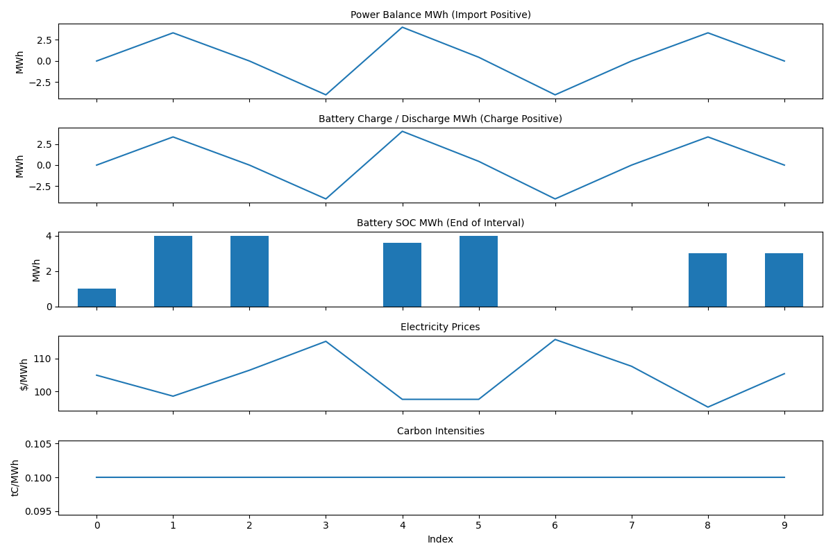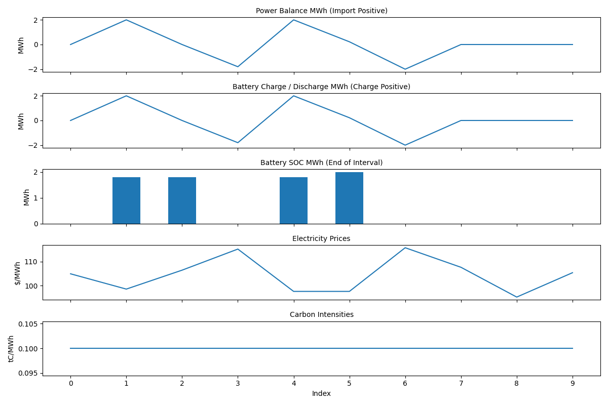 As expected, the battery continues to charge during low electricity price intervals, and discharge when electricity prices are high.