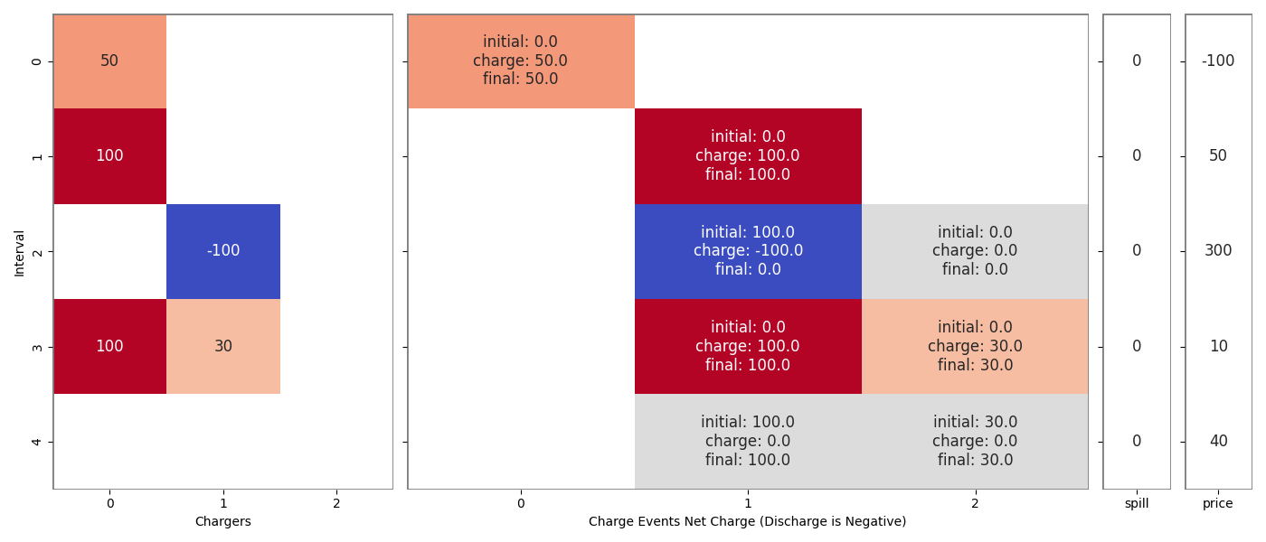 This allows the linear program to be feasible, while communicating directly which intervals or charge events are causing the mismatch between charge event demand and spill charger capacity.